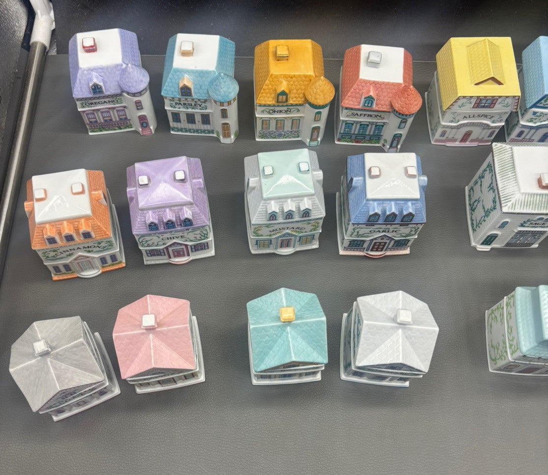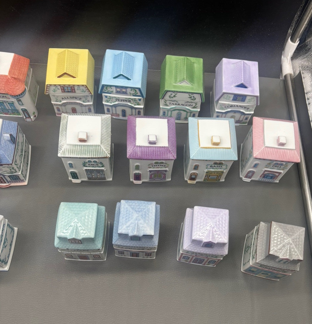 Complete your collection or start a new one with this beautiful 1989 Lenox Spice Village Set of 24 jars. These vintage jars are in excellent condition, with no chips or cracks. The rubber rings are all intact, ensuring a tight fit. The set features charming Victorian house designs, making it a wonderful decorative addition to any kitchen or collection.