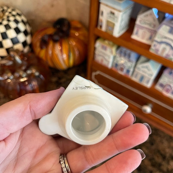 Condition: Excellent overall condition with one small imperfection: The top back of the Parsley jar was broken at some point but has been glued back together. The repair is not noticeable from the front and does not detract from its overall appearance.