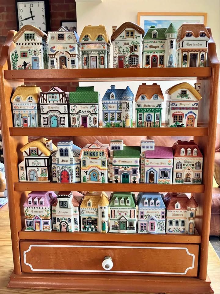All spice jars in excellent condition, all have their rubber seals, no chips, or marks. Spice rack is missing its triangle roof, but can sell without. Happy to send more pictures on request. Buyer to collect. List of jars Parsley Sage Nutmeg Rosemary Tarragon Ginger Chives All spice Onion Celery salt Paprika Garlic Basil Saffron Mustard Oregano Cloves Dill Corriander Marjoram Bay Thyme Pepper Cinnamon