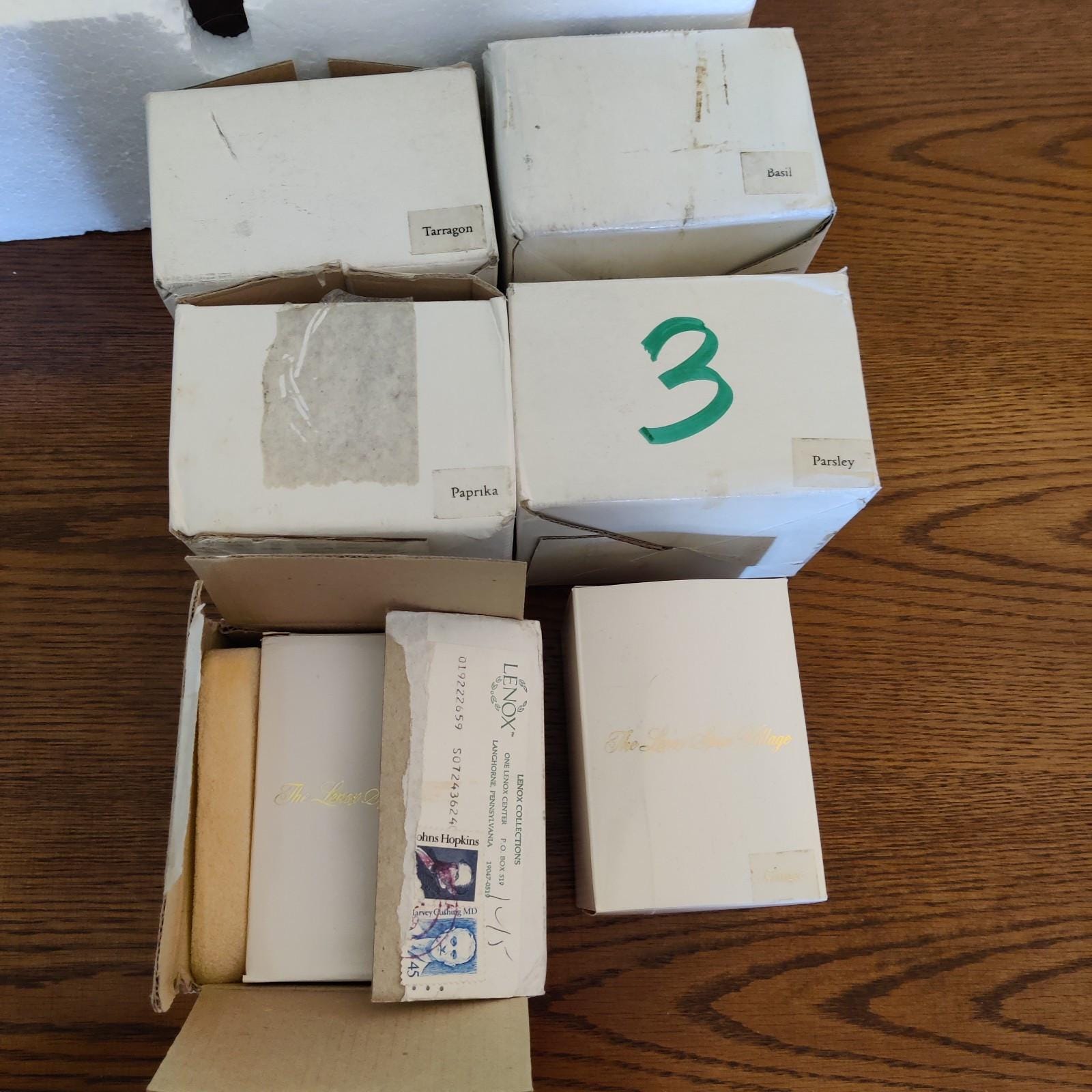 This set was never displayed. The jars are in their original packaging and most have their original mailing boxes. I also have the Styrofoam, but not the box, for the wooden rack. The knob has never even been installed onto the drawer. I am leaving it that way so my buyer can install it if they want to. All jars are marked 1989. I have the original paperwork shown in photo.
